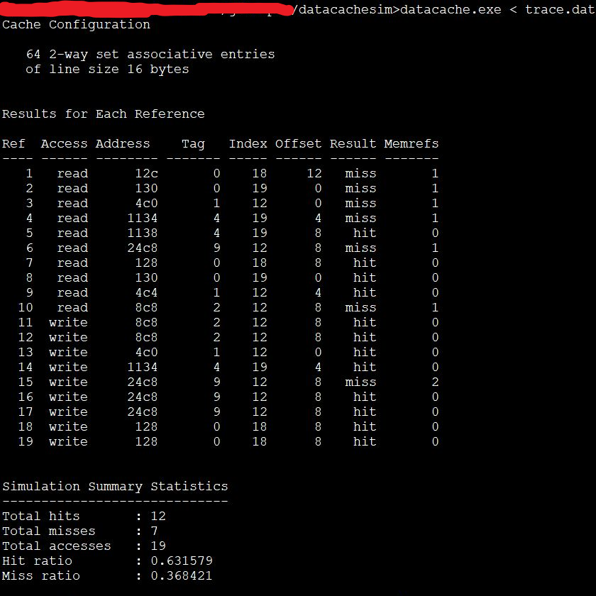 This program simulates a datacache using a LRU (least recently used) replacement algorithm and a write-back and write-allocate policy.
