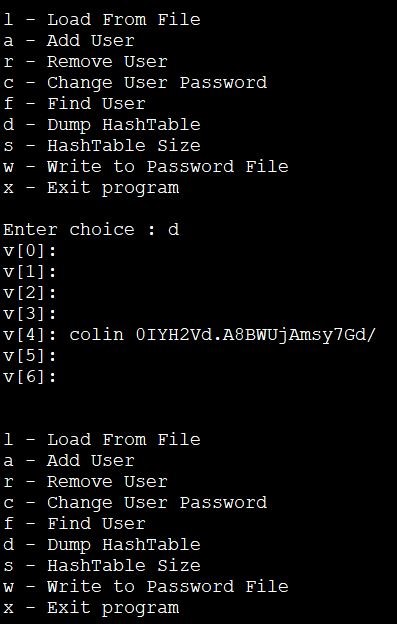 This program simulates a server containing usernames and encrypted passwords, implemented using a hashtable. Besides adding users/passwords, you can view the server's contents